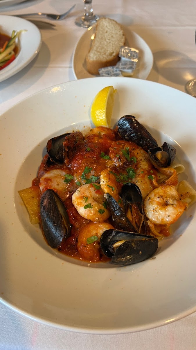 Fresh Oven-Baked Clams, Mussels and Shrimp with Oregano, Fresh Tomato, Garlic and Olive Oil, Served over Pasta